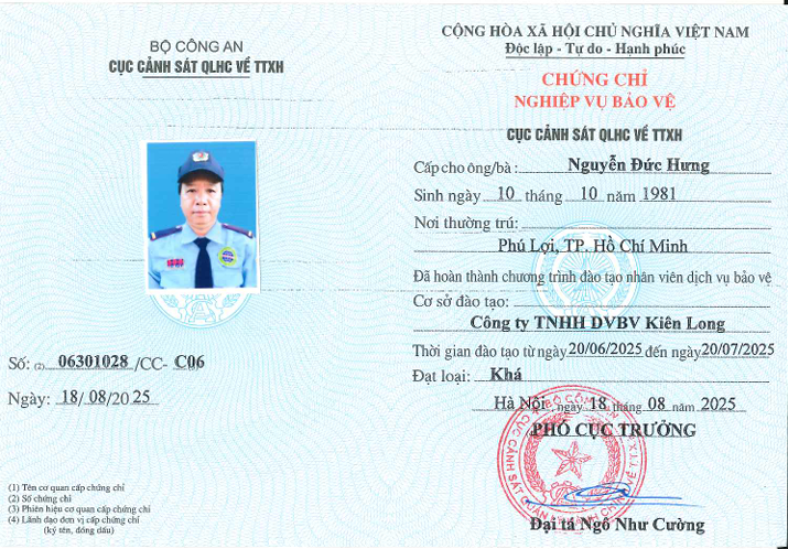 Cấp chứng chỉ nghiệp vụ bảo vệ hợp pháp theo quy định của Bộ Công an.